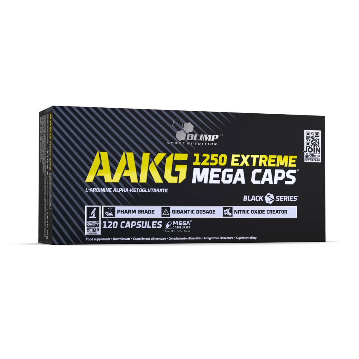 AAKG 1250 Extreme Mega Caps sisaldab 1250 mg L-arginiin alfa-ketoglutaraati (88% AAKG-d) kapsli kohta, mis annab 813 mg L-arginiini lämmastikoksiidi tootmise ja kreatiini biosünteesi toetamiseks. Toidulisand on mõeldud füüsiliselt aktiivsetele täiskasvanutele ja tippsportlastele, kes soovivad parandada lihaspumpa, vastupidavust ja taastumist. Üks kapsel võetakse iga päev enne treeningut või seksuaalset tegevust.