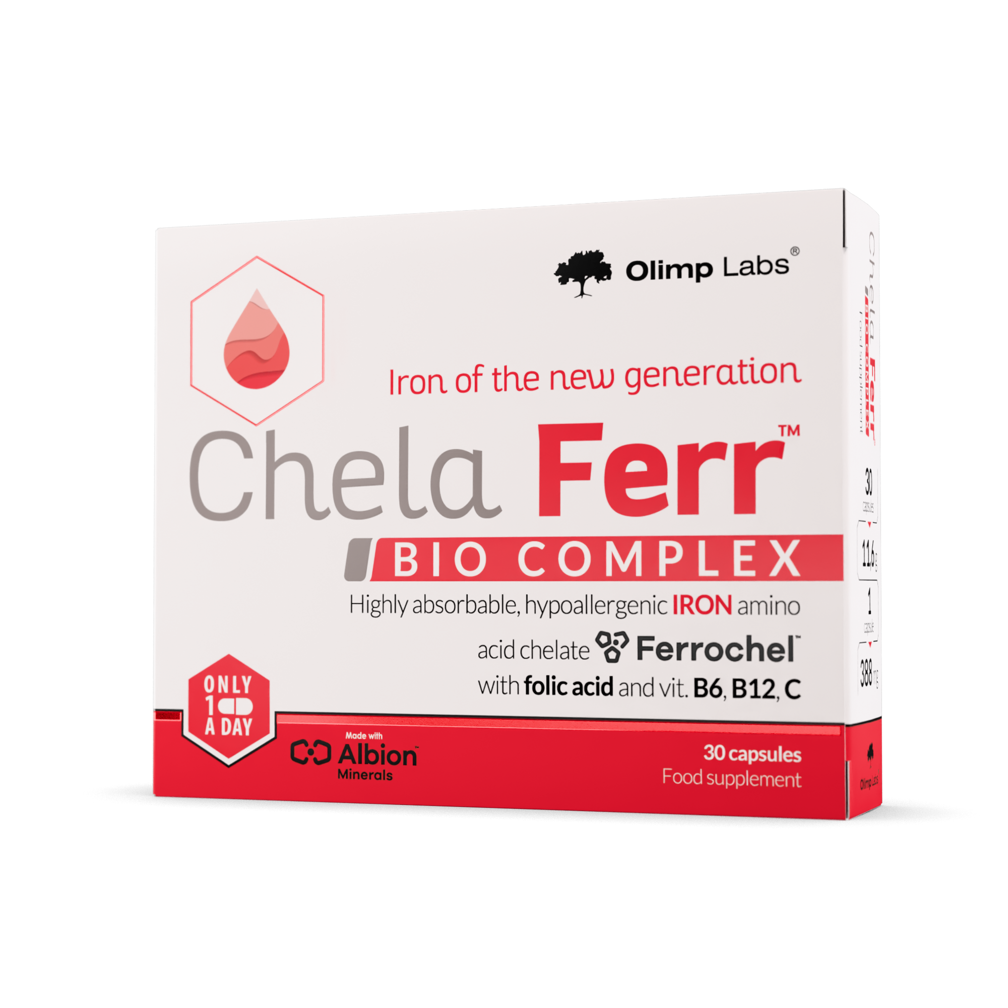 Olimp Chela-Ferr Bio-Complex on rauapreparaat, mis sisaldab kõrge biosaadavusega Ferrocheli aminohappe kelaati (raudbisglütsinaat) vormis, mis on õrn maole ja vastupidav happelisele pH-le. Valem on rikastatud foolhappe ning C-, B6- ja B12-vitamiinidega, mis koos toetavad normaalset punaste vereliblede moodustumist, energiavahetust ja väsimuse vähendamist. See on mõeldud täiskasvanutele ja lastele, kes vajavad raua lisamist.