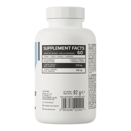 OstroVit L-Carnitine 1250 mg is a dietary supplement that contains high-quality L-carnitine tartrate. It is a preparation available in the form of easy-to-swallow capsules, designed for athletes and people distinguished by an increased demand for a valuable compound.