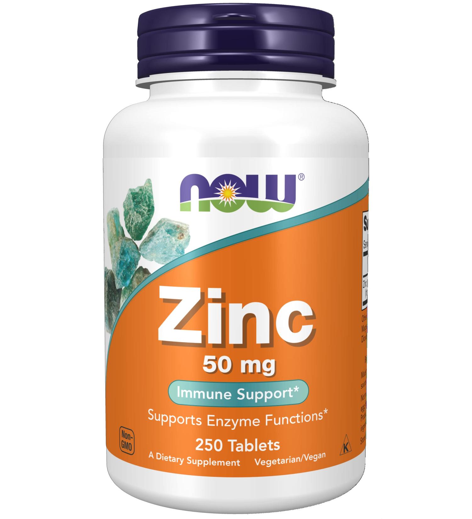 NOW Zinc 50 mg tabletid sisaldavad 50 mg elementaarset tsinkglükonaati tableti kohta 250 tabletti sisaldavas pudelis, toetades immuunsüsteemi kaitset ja ensüümide funktsiooni.